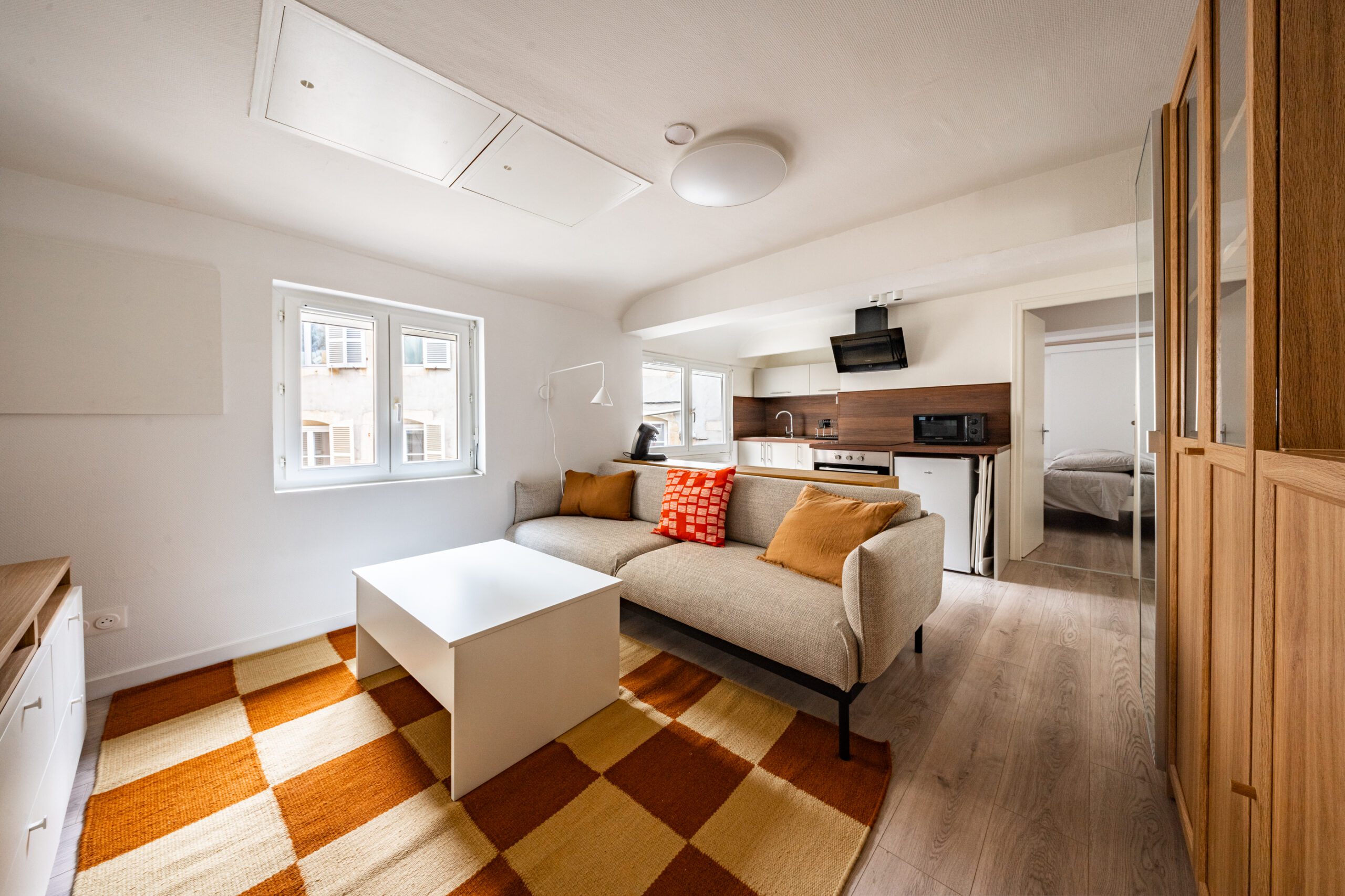 La hauteur sous plafond étant inférieure à la moyenne, la décoration a été pensée pour transformer le T2 en un espace chaleureux, lumineux, confortable.
